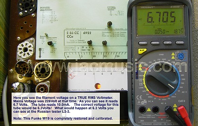 You see here a TRUE RMS Voltmeter, and it measures 6.7 Volts heater voltage instead of 6.3 Volt, when testing an ECC88 tube. The heater voltage of this tester cannot be adjusted, so it is one winding for 60mA heaters, and 3Ampere heaters as well. When it gives 6.3 Volts at 3Ampere, then 'only' an increase to 6.7 Volts at very small current is not even bad. This is a good transformer. The problem with this however, weak tubes tend to give significant better readings at already 6% higher filament voltage as here. The effect is even more with DHT tubes. So an older DHT tube may easily read 10% better than it is. As long as you know this, you know what you're doing, but... there is a very elegant way to correct this. For this, please read the following part about mains voltage.