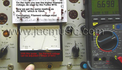 In the next picture, we repeat the Funke W19S measurement with the same ECC88, on a more versatile tester, the Russian L3-3. With the L3-3, you can perform any test you like, so imitating a W19 is very easy. We just set it the same as the Funke W19 card Nr 1088, which is for the ECC88, including the TOO HIGH filament voltage of 6.7V the W19S uses. The result is really as expected. You can see both testers show the same number: 10.0 mA very precise. At least this gives a very good feeling about the good function of each, and the good calibration.