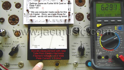 This tube measured 10mA on the Funke W19. When this test was repeated on the L3-3, with the correct filament voltage for this tube, it measured 9.5 mA instead of 10mA. So I do want to say, the current measurement and anode voltage is awfully precise, but differences with heater voltage compromise the result. This is However, the same problem with almost every tube tester. The ones I know that do not have this error, are AVO VCM 163, and the Russian Kalibr Tester L3.