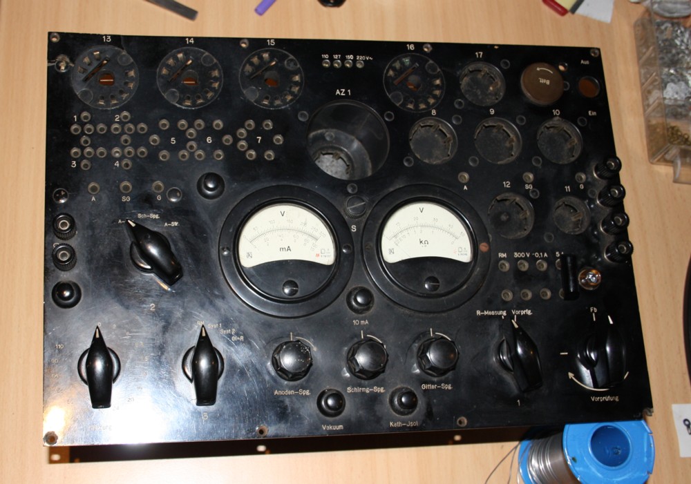 The case was incomplete, and the deck plate is cracked at the corners. Yet the tester is a very nice one, since it has adjustable grid voltage, adjustable Screen grid and adjustable anode voltage, all DC voltages. The rectifier tube (where it says AZ1) can be exchanged from the tube deck itself, and the tube glow shows you the tester is "on". Same as with 1925 radios. Very nice.