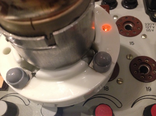 I took it from an old switch. It is a normal small neon lamp without series resistor. The way I connected it, was like this: First a 10k resistor across the heater. This protects the tester in case the tube heater is open. Then the neon lamp with one end to the heater (doesn't matter which end). The other end is connected via a 2M2 resistor to the plate. The lamp current is only 0.1mA so this little error has to be accepted. The left switch (if set to "Paramers") switches on the anode voltage. So with the Neon Lamp in there, you have better awareness, to remember to switch on and off the HV before exchange a tube to test .