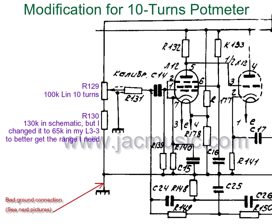 Change of the Transconductance Calibration pot meter before a transconductance measurement, you need to calibrate this circuit. This method greatly improves the accuracy of the measurement, making the L3-3 probably one of the best (or THE best) tester there is, for transconductance measurements. Measuring transconductance with an audio frequency AC signal is the best way, as this eliminates the mains hum. (and this would make your Gm measurement be wrong). Mains hum also comes in when you approach the tube with your hand. Another factor is tube unlinearity, will make the Gm measurement not accurate, because unlinearity is just a form of distortion, and distortion ADDS harmonics to the signal. These harmonics will increase the Gm reading, which is a measurement error. For this reason the L3-3 works with a VERY precisely tuned band-pass filter. However since this circuit is temperature dependant, and since the aim is precision, you need to calibrate this before beginning to work with the L3-3. Only thing is, this calibration needs to be done too often. This is what pot mter R129 is for. Sometimes before every single measurement, which is annoying when using the L3-3 for testing many tubes of one kind. I found when the pot meter R129 is replaced by a wire wound 10-turns pot meter, the circuits stays stabile for a much longer time, and working comfort increases significantly.
