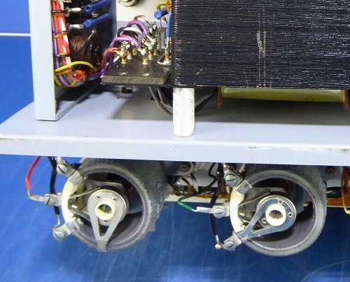 The Rheostats are always a MAJOR problem with faulty testers, so beware you don't buy one with defects, which you think to fix quickly. Probably you will not be able to fix those at all. I will not tell you my secret tricks here, but in case you have one with a broken wire, I probably can repair it for you. The Rheostats of this tester, described here, were all good, they just needed cleaning and lubrication. All in all, this tester appeared hardly used, which becomes visible when you take off the finger of the Rheostats, and you can see the wear of the center contact. A lot of wear means also the resistor wire is scraped off to some extend, and one day will develop an open contact.