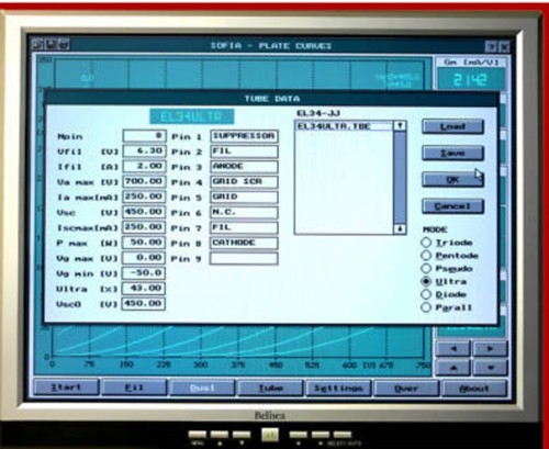 The Kayal used to be available on Ebay, but they were never really cheap. It's one of the finest real DOS machines. I have not tried it, but I expect it can run Windows7 because it has 1Gb of RAM. Though the W2000 works still fine, it hooks up in the network still, it has USB, and I have noticed, W2000 doesn't get slower when it gets older. Something you can not say about XP, and sure not about W7, which suffers from aging. Also, W2000 is FAST. Much faster than Windows 11. So I stick with W2000 for my test computer. After the tests are done in DOS, I can re-boot in W2000 and copy the results on a USB stick and take it to a modern PC. From there I open the results again with a DOSBOX virtual machine. The regular virtual machines, they all don't work. The good thing is, once you have the Sofia software working, it is the best piece of test software I have ever seen. Even under DOS, the speed beats anything, and Graphics quality is good. If you have an XP machine, the Sofia software runs fine, but it can be used only for looking at test result files (the .pte files). I use this option a lot, because once you have a .pte file, you can plot the curves on your screen once again, and move the cursor all around to analyze the curves, and get gain, transconductance and Rp at a random point. Also matching can be done afterwards, or repeated with a few of the tubes removed from the list. Still for actually measuring, you need DOS always.