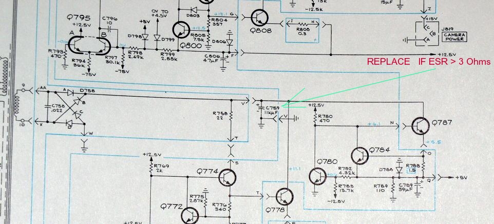 With respect to the Tektronix designers, but the rectifier circuit is strange. The output signal is 5V DC, 100mA to feed 6 TTL IC's. Only 100mA, and they are using a big chunky capacitor of 11.000uF, followed by a series regulator, with a heavy power transistor. Very bulky, and I am sure this could have been done with less parts. Or perhaps it was right after all, read below under ESR meter. Such things do contribute to the massive weight, and I see this philosophy, that 'cost, weight and size play no role', throughout the whole machine. But let's not criticize Tektronix for that, because any 50 years old equipment with savings on material cost, too simple circuits, and too small build, are not fun to work on.