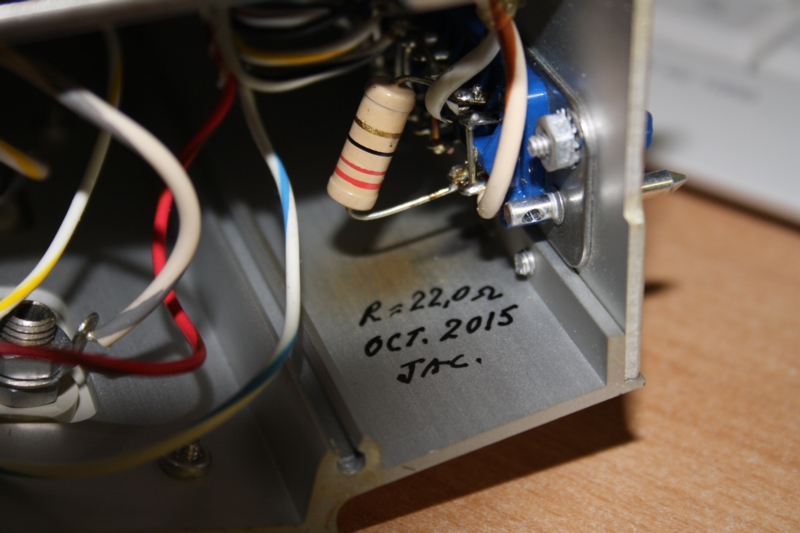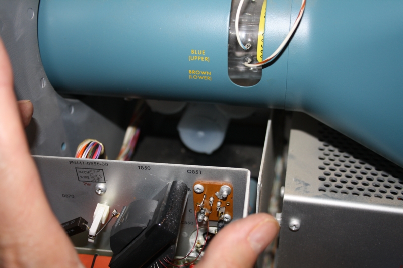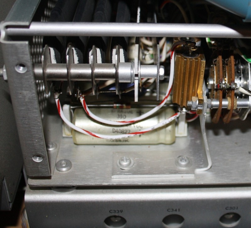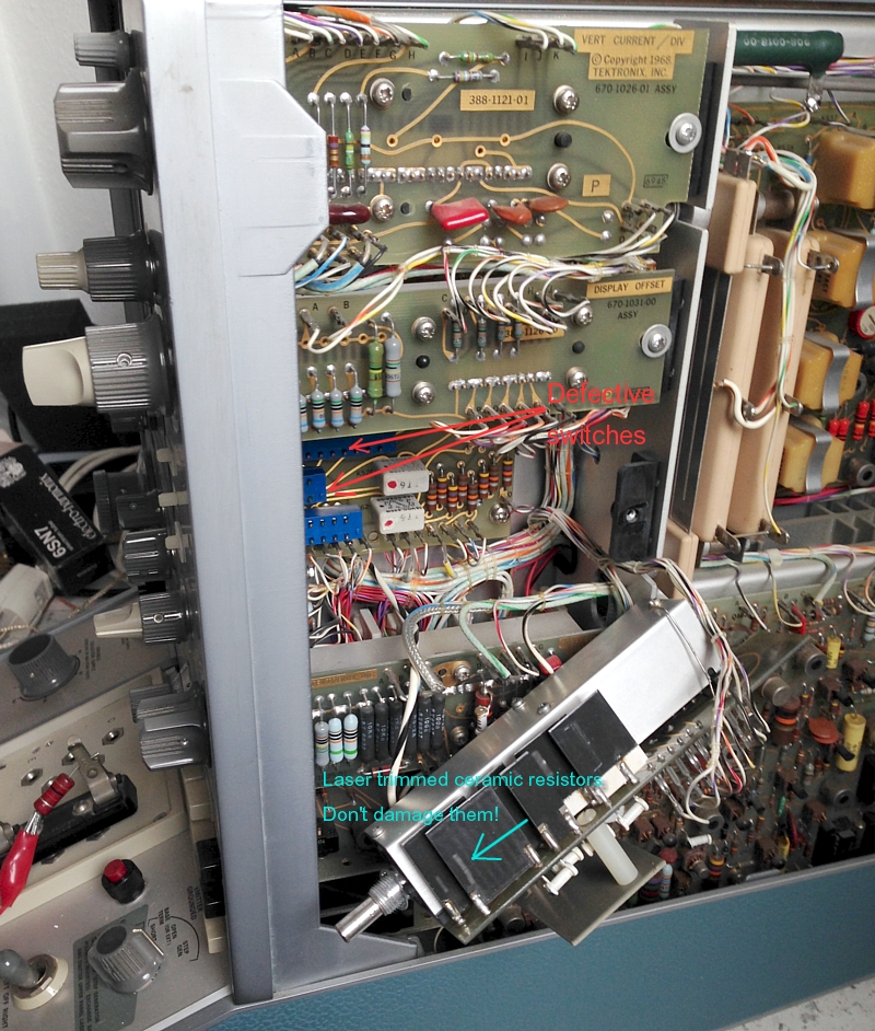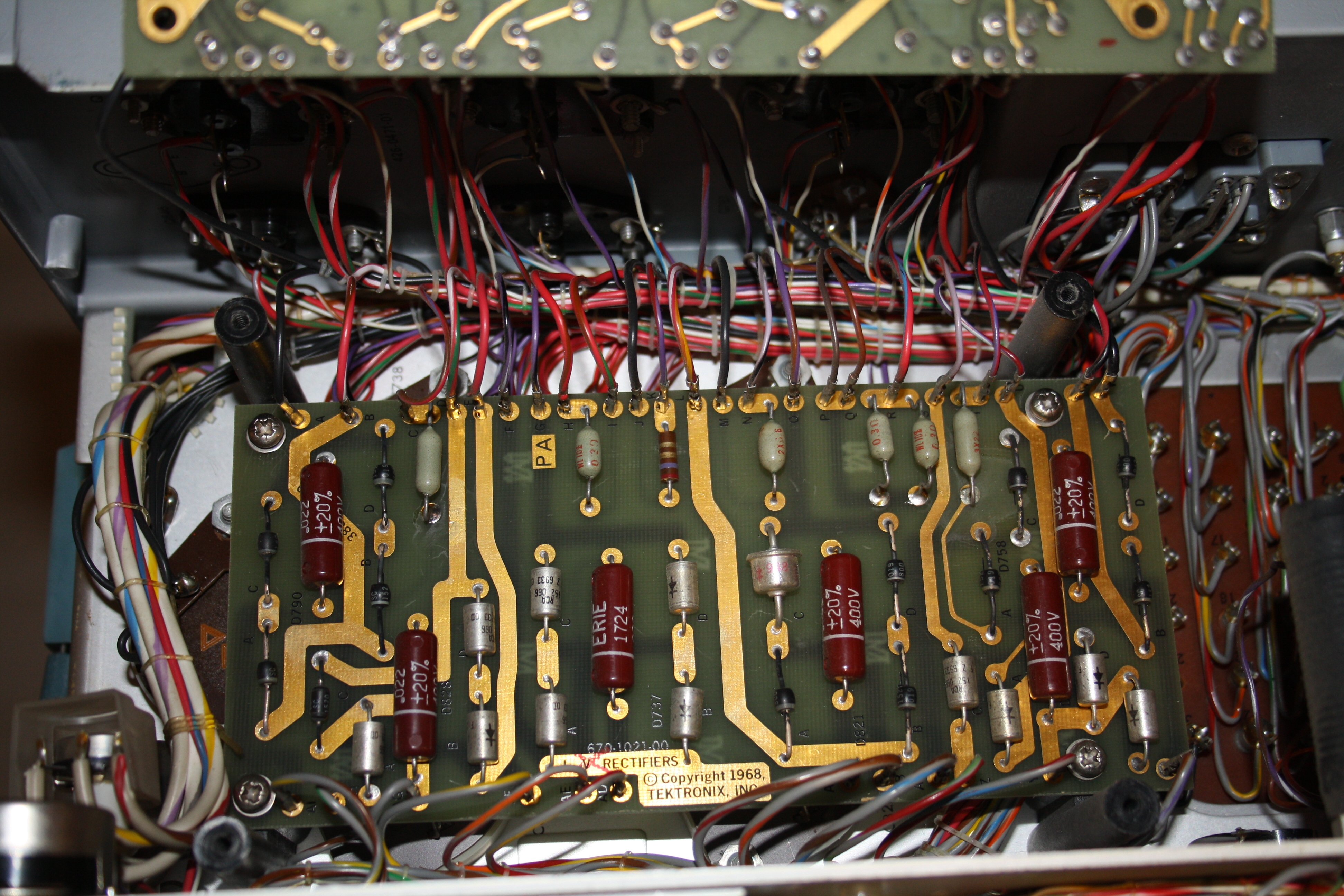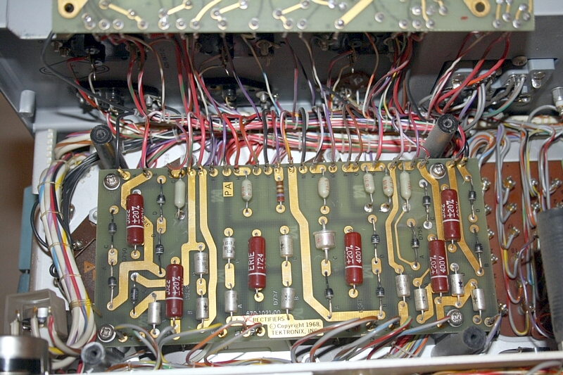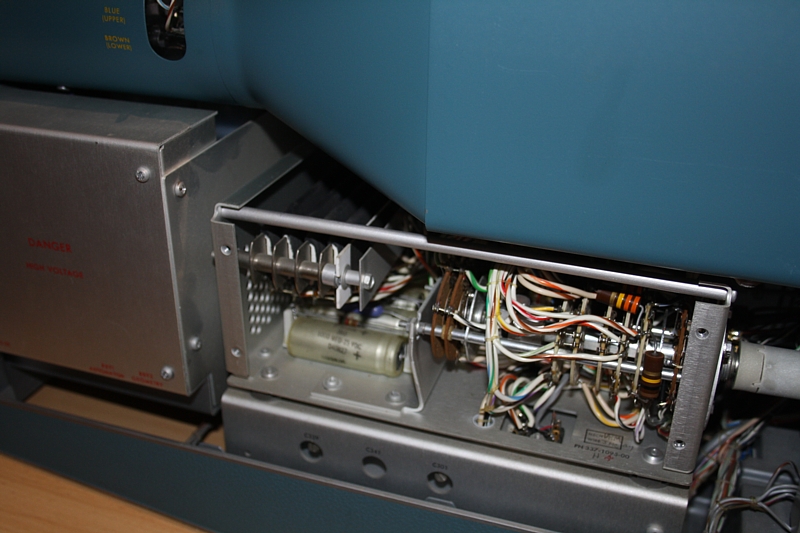 On the left are the series resistors, with a thermal protection mounted on it. Note, the inside chassis is nicely sprayed in Tektronix blue. This is waist of money and resources if you ask me. But as I wrote before, 1968 was another time.