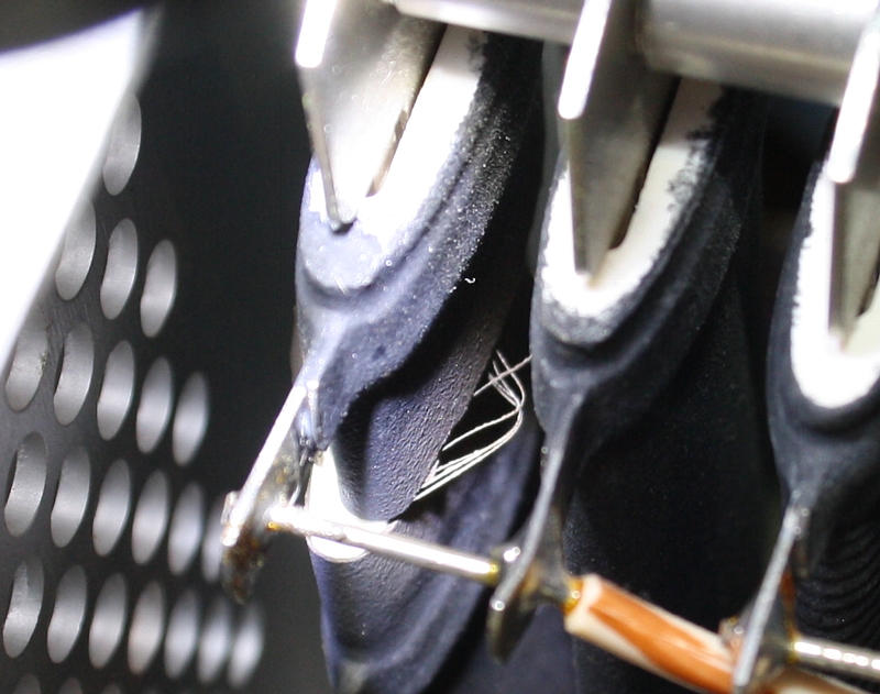 WARNING: Later I learned how to burn those resistors. There are two in there, one for each position (left-right) of the fixture switch. I received my 576 with one resistor burned, I soon burned the other one myself. This is how it happened: On the text fixture is CBE for transistors, and two additional holes for whatever it is. When attaching a device to those two holes, you can nicely do AC measurements on it. However, when you try to test a high current device there, those 22 Ohms resistors go up in smoke. High current testing I do via the Collector-Emitter terminals, and then it works fine.