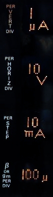 The bottom unit is for the steps. For transistors you set to uA base current, and it gives the Beta. For FETS and Triodes, the steps are in Volt, and you get the Gm. Note, a FET and a Triode are essentially the same for a curve tracer. So even on the very old 570 that was made before FETs existed, you can test FETs.