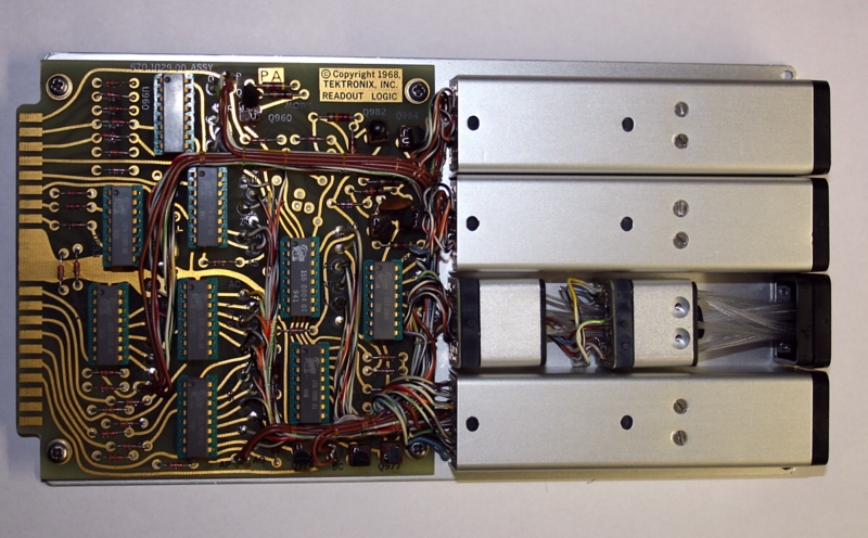 With older equipment, when soldering begins to detoriate in general, lots of trouble will come your way. Not so with this beautiful soldering quality from Tektronix. This is the lamps driver IC, when you pull it out, you can apply 5V to the outputs, and see what lamp is broken. So in this picture between the brown wire where it says 'AP' and the IC outputs 9...15 you can apply +5V and that will light up one of the lamps. Some lamps give funny patterns, and only the right combination of lamps builds the symbol. So the IC's have some encoding logic inside, and the lamp drivers. So we have an all hardware dot matrix unit here, made with light bulbs. May sound primitive, but on 1968 there was no other option. And really with the white light and brilliant sharp symbols, it is very well done and very useful. I think this was a little bit an art project of the designers also. The readout card was expensive and optional. I guess it's still expensive today on Ebay.