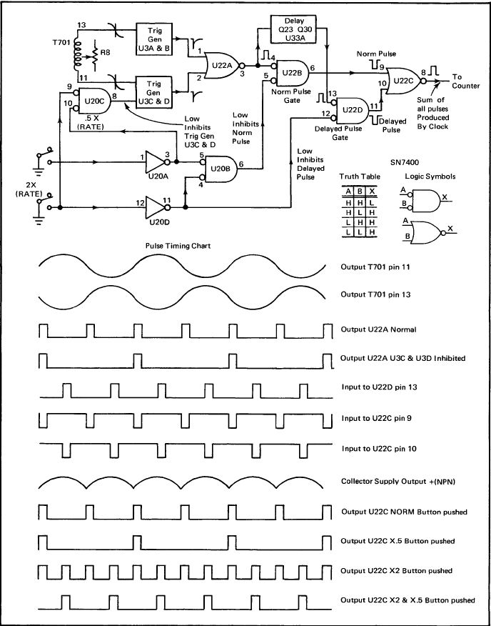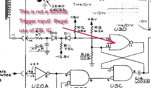 Does that create a problem? Well, perhaps it does in my TEK576. Now I remember the early days of using SN7400 myself. It was "the" IC, all students were playing with, by Texas Instruments, and we did strange things with it, like making oscillators, and it worked. Later, these circuits, might fail when next generation faster ICs were used, such as LS Schottky or HCT (high speed CMOS) versions, 74HCT00. Reason is simply, there is the forbidden zone of the TTL input signal. Of course you need to pass this zone when switching from 1 to 0, or vice versa, but you must pass it with a minimum speed. In all other cases you need to use the more expensive IC's with Schmitt Trigger input.