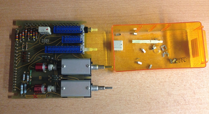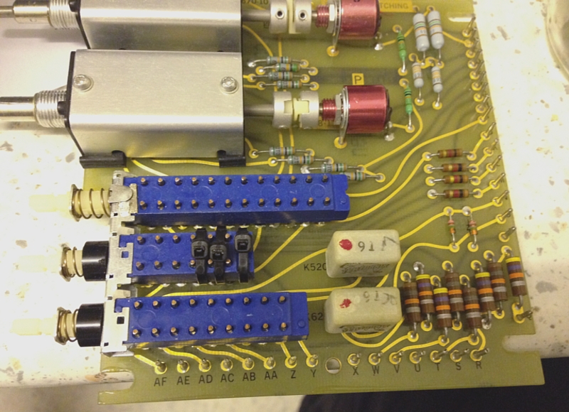 What you cannot see, the contact oil has also loosened the bottom of the middle switch, and that made the arm come out 2mm too far. I could clean it, the green stuff resolved in alcohol, the brown stuff would come off with fine abrasive paper. The switch bottom had no great force on it, it could be repaired as you can see on the next picture. I have been looking a little bit for such a replacement board, but it was kind of rare, or too expensive. However, the switches as such can be found still from other Tektronix oscilloscope boards, and perhaps from the manufacturer too, but I don't know who that is. They look kind of standard switches to me. Note, to have more room for the repair, those white cubes are relays and you can pull then out of the board just like that.