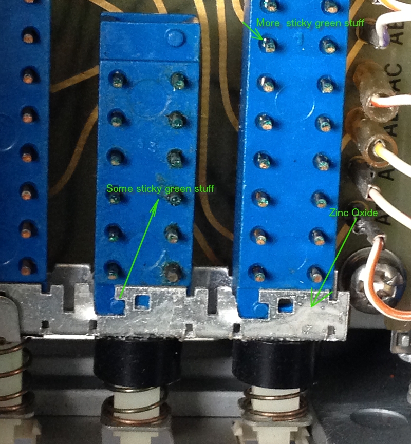 Look at the spray container, the C60 contact oil has created a fat, sticky brown layer with rust. Similar to the green stuff inside the switches.