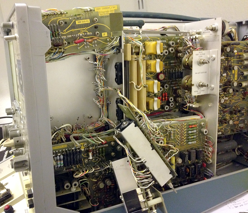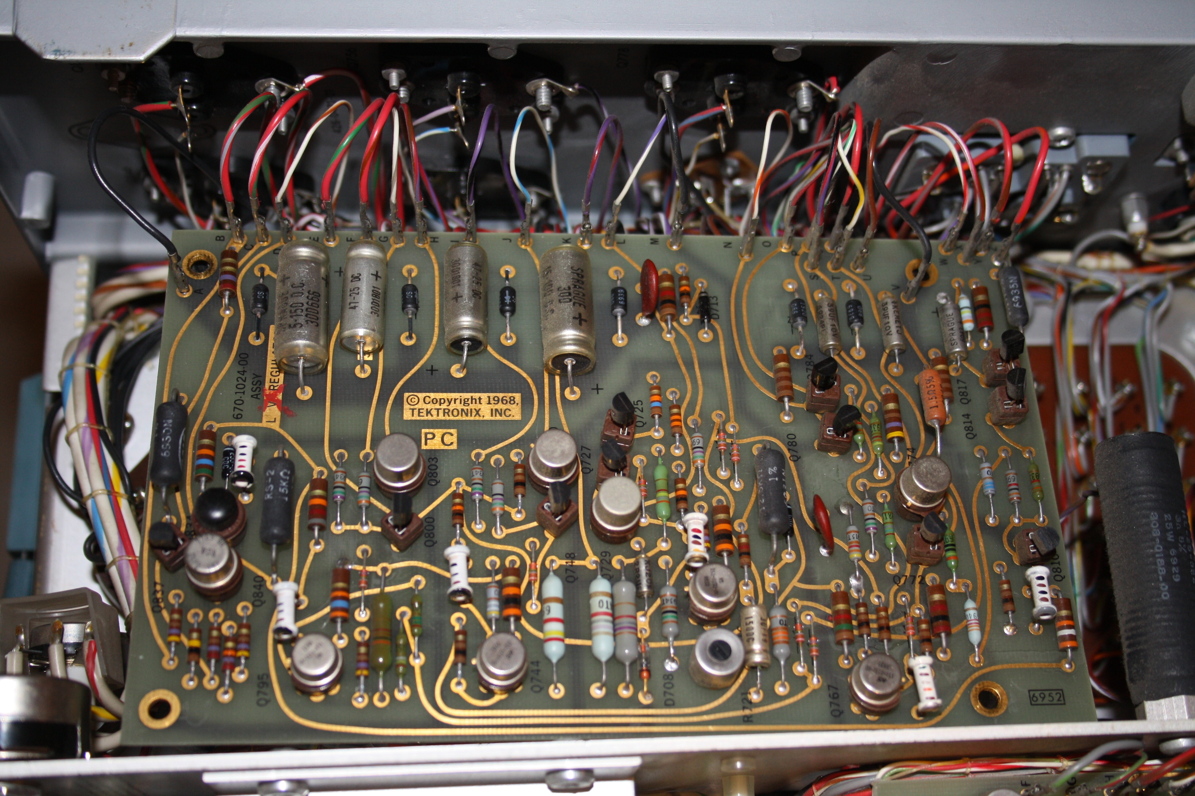 Still, because one appeared bad, I decided to I de solder all capacitors of the power supplies. There are two PCBs, mounted over them, and you need to remove those, by unplugging the connectors. Also take your chance to correct the connectors a little bit, as some of them got a bit loose ever since 1968 when it was made. My ESR meter indicated all capacitors 'like new' except for C759 of the 5V supply. It had so high ESR, it was regarded broken. Other 576 users report C759 broken as well, so it is a common fault error. I opened it up so see what's inside, and it was very wet still. So sure not dried up. Still ESR was 'infinite' on the tester. So this is really interesting to see, so many of those old electrolytic capacitors were still perfect ever since 1968. Here comes a point, all good electronic designers know: Lifetime of electrolytic capacitors increases drastically when you have a low AC ripple current through them. So with this power supply, perhaps also 1/3 of the capacitance value might have done the job as well, but then ratio of ripple current and capacitance would have been '3 squared' higher, so 9x higher, and lifetime would have been even more drastically reduced than a factor 9. There are tables for that, in any capacitor meant for power supplies, and you can bet those guys at Tektronix knew how to test capacitors with their own curve tracers. So on the one hand, the capacitors seem extremely over dimensioned, but on the other hand, what is sure, almost every one is still good now ever since.