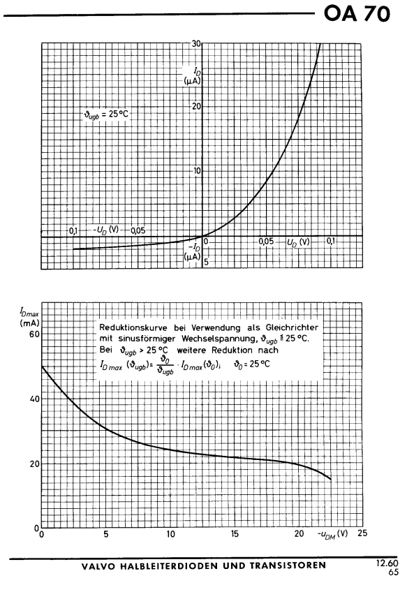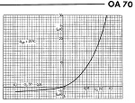 Shown here at the same settings of the previous diode (it was 1N4148). This data sheet is from the 0A70, but the diode under test is another, I do not have the part number of it. By changing the scales of the TEK576 it would look similar. Please read the text of the above Silicon diode first. A Germanium diode, curiously, does not seem to need a minimum voltage before it becomes a diode. It is clearly visible it has some dynamic resistance at ZERO Volt. The angle is appr 45°. So Ri=50mV/1uA = 50kOhms. When going to NEGATIVE voltage, like only -25mV, you will see Ri will be 100k, and when going to +25mV Ri will be only 25k. This has a rectifying effect already. I have never found any good literature on this, but THIS is the reason, why Crystal receivers use germanium diodes, and why they can not work on a silicon diode. It is not because of lower forward voltage.