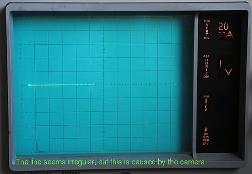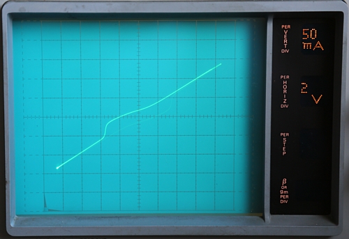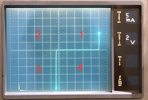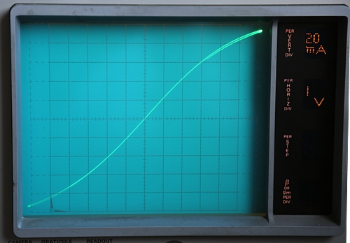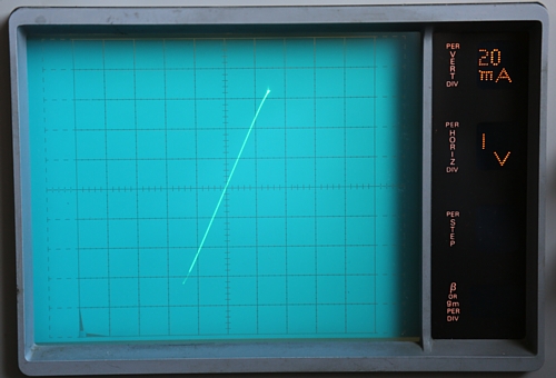 I turned the amplitude knob such that break down just begins with the first curve (200uA), and also the zero current line, show this break down. At higher amplitude there would be a vertical line, beginning at 7 Volts horizontal