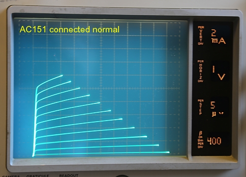 Now with a transistor this works a lot better. It amazed me. Probably such a transistor is not a very good one, but at least curve charts here look nice to me and Beta is not so bad. (One division, so 10x). It is unknown what maximum current and voltage it can do like this, and I didn't want to destroy the transistor to find out. So I stopped at where you can see in the curve chart. Note, what is tested here as collector-base junction, is normally is the base-emitter junction. This means the original base-emitter is now connected in reverse direction, and I don't expect the break down voltage of this diode to be very high, and perhaps break down is destructive too. So I stopped at 10V 5mA, but the transistor responded still very predictable and nicely.