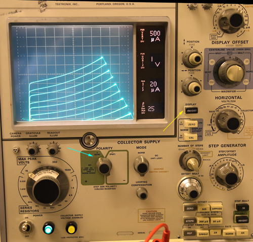 This is quite strange, but with the TEK576 it is just a flip of a switch. (see the green arrow at the left). So why not do it. This inverts all voltages, and it means a PNP transistor gets simply used as NPN transistor. To display the sweep still from the left to the right, the whole picture tube gets electrically rotated 180° with the 'invert' switch. So the green arrow is the electrical invert, and the yellow arrow is the optical invert. The curves look not nice, and they are only nice at very low power, as shown here. The curves seem to sink away under the horizontal axis. (This is not the TEK576, this is by the transistor itself).