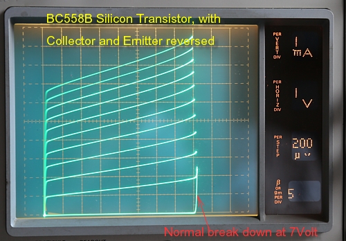 So when we use the whole transistor reversed, what is now the collector-base for the curve tracer, is in reality the emitter-base of the transistor. So these curves will show a collector (base) break down voltage of 7Volts, as you can see from the second picture.