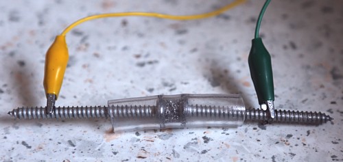 Here comes the amazing thing, which will puzzle you straight away. Build this item as you see here above. Press the iron filings stiff together, and then release it 1mm. It is ready to use now. Test it at 3V and no current will flow. Nothing! You thought perhaps iron is conductive? Well, not like this. You can shake the filings, use a magnet, or do whatever you like. I called this state-1 in the picture.