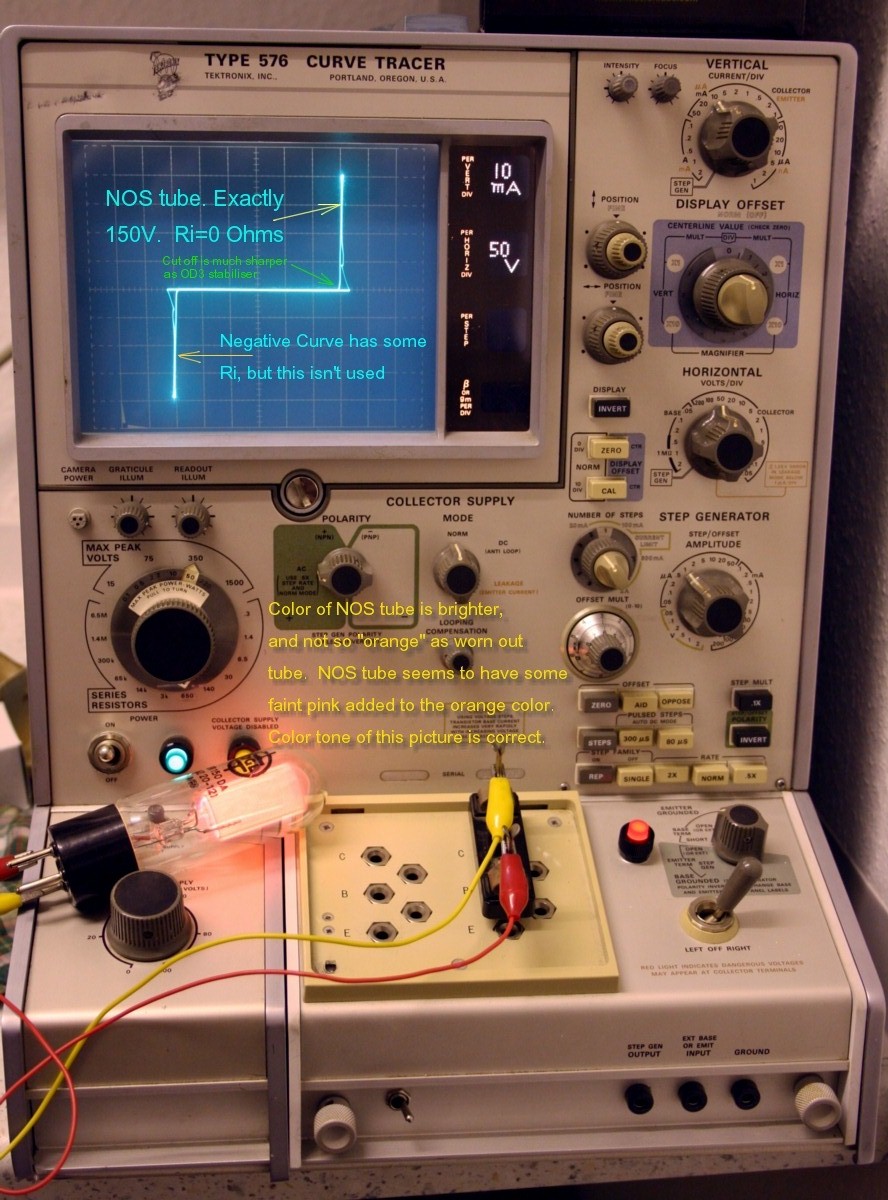 Now, that I have a curve tracer, I can see the difference between a used and a NOS tube, clearly. The NOS behaves like ideal. It has no Ri, and not round cut off like OD3 stabilizers show on this curve tracer. So clearly, the GR150 tube is a very special quality. Behavior is more like a Zener diode, and better than any other stabilizer tube I tested. Though problem with a Zener is very large temperature drift. Whereas this stabilizer has no drift at all. I have learned from analyzing the GR150 with the 576, there definitely no replacement for such a fantastic tube. So replace it by some other stabilizers, and you have not such a nice, truly vertical load line. Replace it by Zener diodes, the load line is better, but these have (TERRIBLE) temperature drift. I suppose GR150 can only be replaced by a very precise electronic made 150V voltage reference.