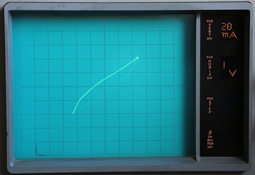 This is a gold plated, glass sealed silicon power diode. It was inside a very old amplifier, provisionally soldered in there by somebody. I exchanged it just because I wanted four of the same diodes in there. From there it came into my curiosities box, some 20 years ago. What does the TEK576 tell me? The diode is fine and no break down at 400 Volt. I didn't want to go any further. It doesn't seem to like current above 1 Ampere, that makes the forward voltage go up too much, but it doesn't even get really warm from it. So lets call it a 600mA, 400V diode.