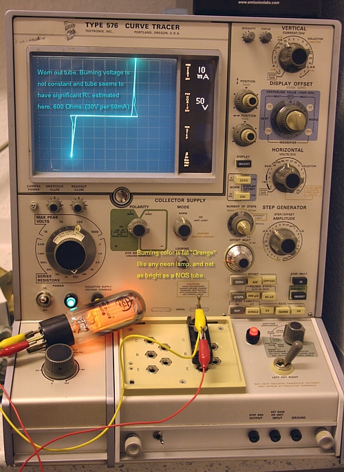 On purpose I have changed the color balance of those two pictures, such that it shows the color of the GR150 correctly. I noticed old, used up GR150 show the normal, dark orange color we know also from Neon lamps. NOS GR150 however, seem to have some other gas mixed with the Neon too. They light up with some 'pink' tone + the normal dark orange neon color mixed. It is such tubes that show this remarkable absolutely ZERO Ohms load line, as I have never seen before with any gas stabilizer whatsoever. At the end of life, this coloring changes to normal dark orange Neon color, and Ri becomes 600 Ohms. So it seems to me, this added fraction of Gas, gets used up until it is gone. Perhaps this is some small form of radio activity which disappears after long enough use, but I have to say I really don't know what causes this.