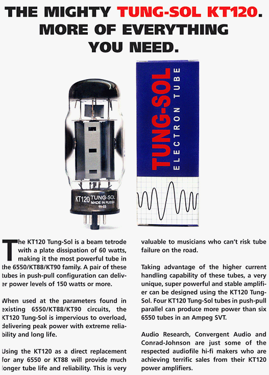 New Sensor now announces the Tung-Sol KT120, which has a plate dissipation of 60 watts, making it the most powerful tube in the 6550/KT88/KT90 family. A pair of these tubes in push-pull configuration can deliver power levels of 150 or more watts. When used at the parameters found in existing 6550/KT88/KT90 circuits, the Tung-Sol KT120 is impervious to overload, delivering peak power with extreme reliability and long tube life. However, taking advantage of the higher current handling capacity of these tubes, a very unique and super powerful and stable amp can be designed using the Tung-Sol KT-120.