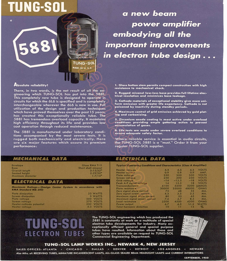 It seems we have a very nice tube here. In September of 1950 Tung-Sol introduced the 5881, an updated and industrial version of the 6L6GA with a 23.5 watt plate dissipation, opening the doors to the hi-fi movement of the 1950s. This rugged tube also found a home in the '59 Fender Bassman and servo amplifiers used in B-52 bombers. In 1955 Tung-Sol raised the bar of high fidelity with the introduction of the 35 watt 6550, which could deliver 100 watts with a pair in push-pull configuration. This tube was used in the Dynaco Mark III and Sun amplifiers.