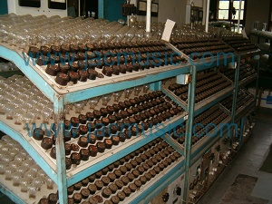 Here us a picture of such a device, as used in the EI factory (now closed). The brown parts are (empty) tube sockets. The light bulbs are used as a current indicator, and as a fuse at the same time. So with just one quick look, the operator can pick out a single bad tube, from such an array of 200 tubes. This works on AC voltage. We go essentially the same way with our burn in device, just we use LEDs to measure the tube current more precisely. Moreover we do not use light bulbs as a fuse, but we use a self resetting thermo fuse on each group of five tubes.