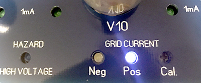 - A grid short. First, a damaged electron tube is not a hard short, like a shorted transistor. A zero ohms short inside a tube, is hard to imagine. The anode current is limited by the emission of the tube, even in case of a failure. A grid short will increase the gird current and anode current a lot, and the red LED will sure catch your attention. Also the white grid fault LED lights up. Depending on the direction of the current, the Postive or Negative LED. If both LEDs light up, there is an AC signal present, wherever it comes from.