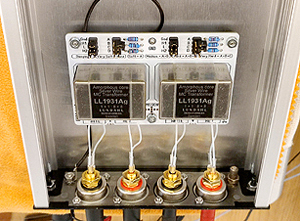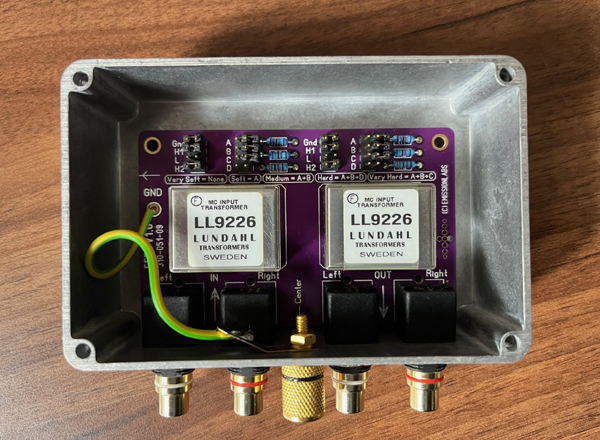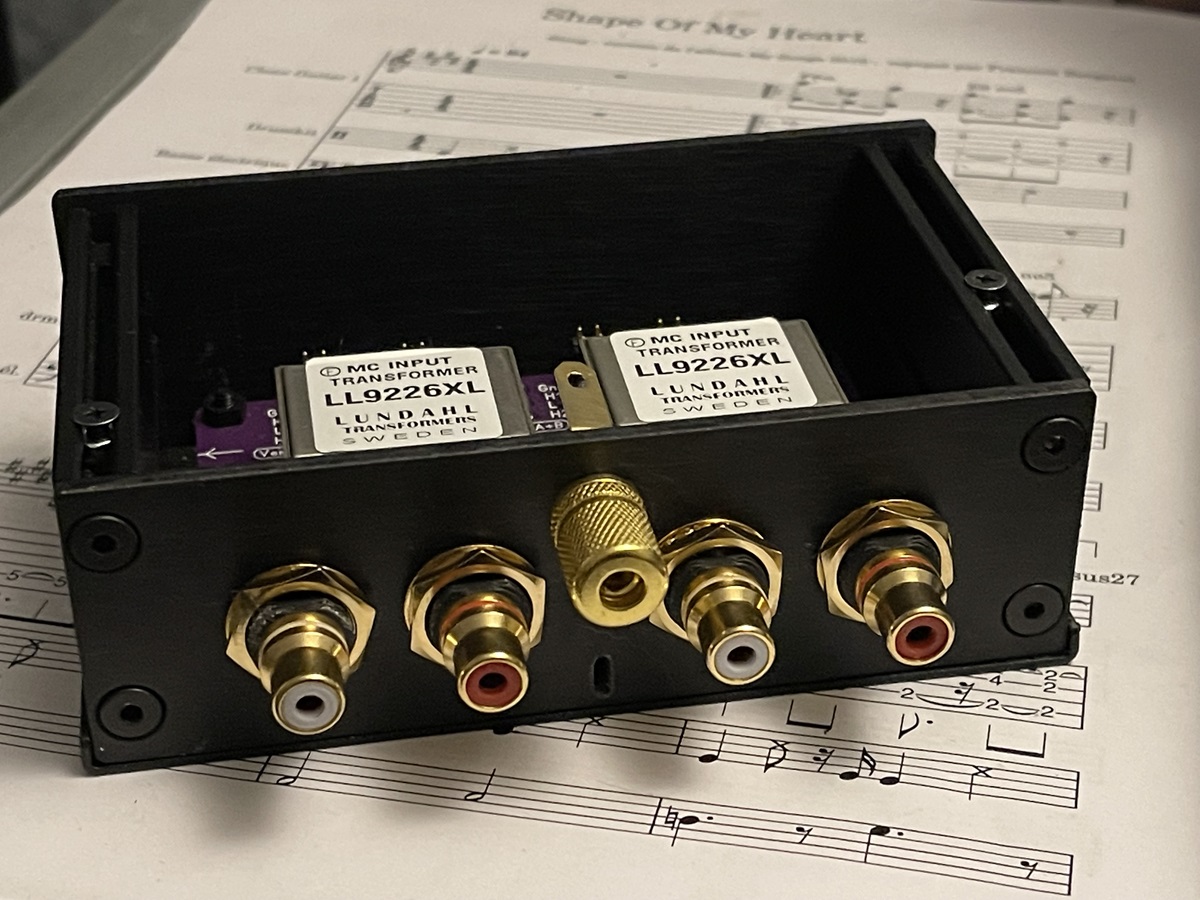 This litte box contains treasure transformers, the pure silver wound transformers LL1931Ag, with amorphous cobalt core. The large box is the EMT128 pre amplifier (Pictured from the inside), using also Lundahl transformers.