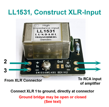 In tube amplifiers, we recommend this PCB with LL1531, to break the ground loop. It is not necessary for this to change to XLR connectors, it can also be done with an RCA connector, as long as the RCA connector is an "isolated ground" type. These are the ones with separate connections for ground and signal, and the ground connection must be connected to the EE31 board instead of to the chassis. (It is the second option, below here)