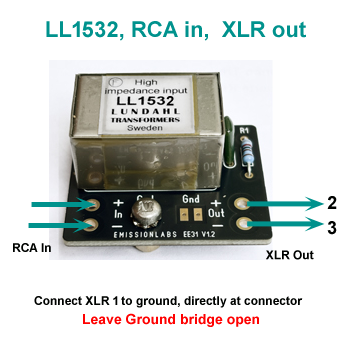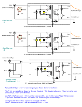 - If used as an output board, the intention is normally to convert an existing unbalanced RCA output to an XLR Output or to a balanced RCA output (isolated ground type). For this, the low impedance transformer LL1532 has to be used. In this case, the Gnd Link is left open, to obtain a floating output.