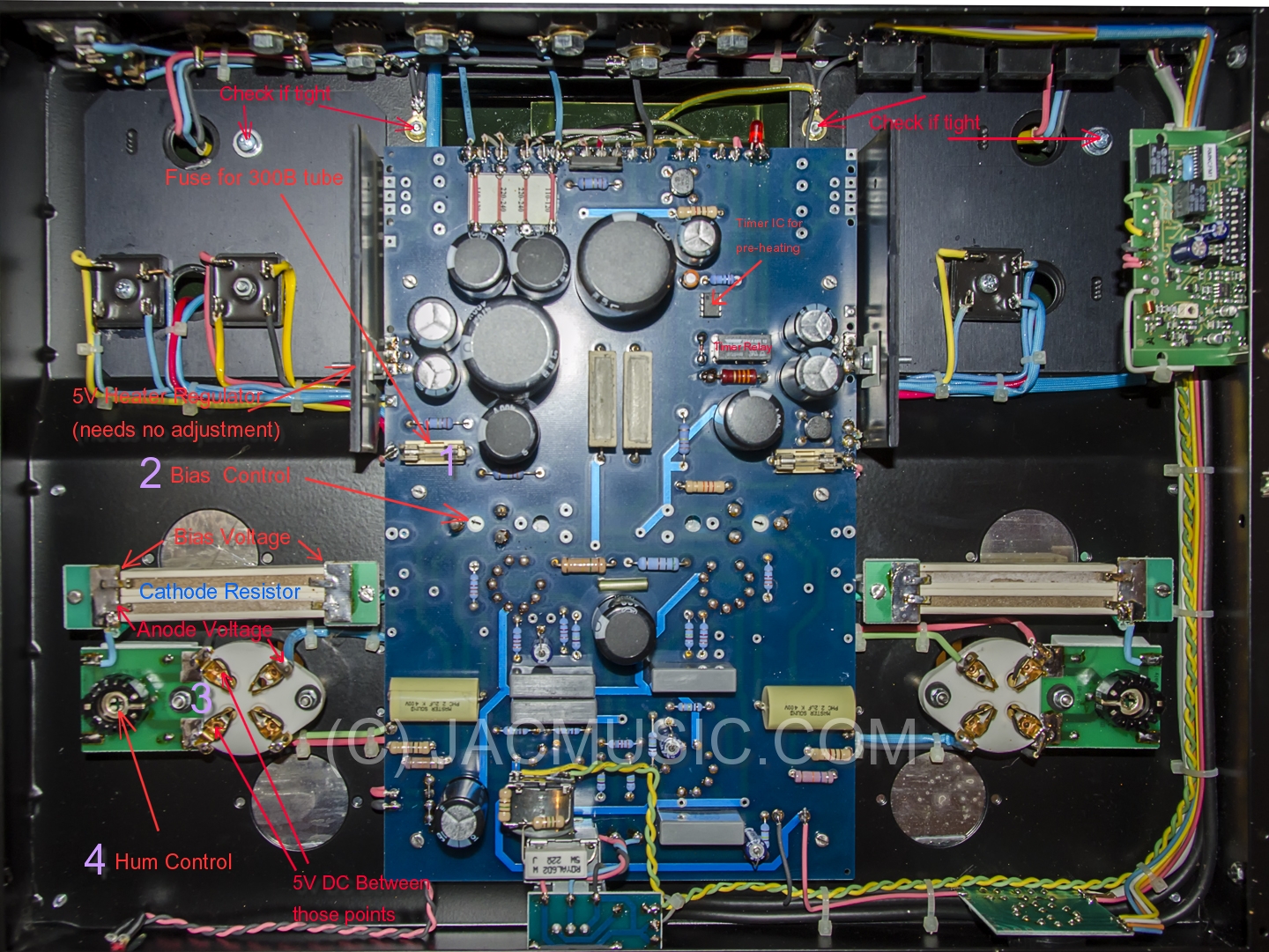 With the bias at minimum, I now remove the old tubes, and put it the new ones. Now I measure if the heater voltage is 5.0V +/-2%. If the 5V is ok, adjust the bias to 20V, using the bias control (2). The bias needs to be checked continuously during the first half hour. Then, every half hour, then every two hours, then after 12 hours the final adjustment. I check it randomly the next 2 or 3 days, and then it is finished. Do not make fine-adjustments, as small changes will result from mains variations anyway. Any change lower than 1 Volt can be left as it is.