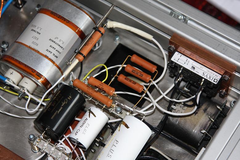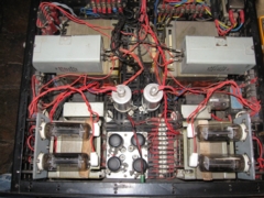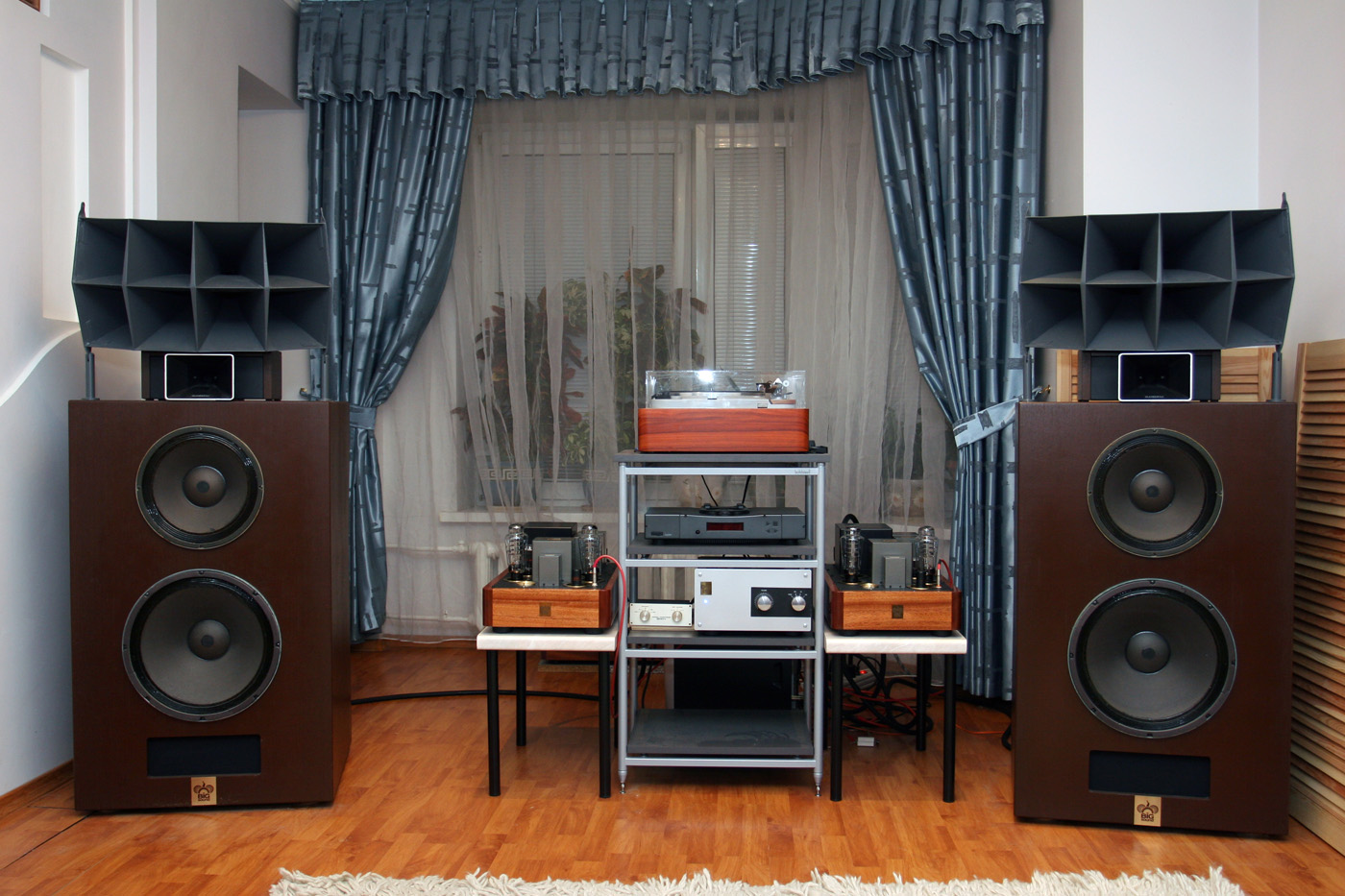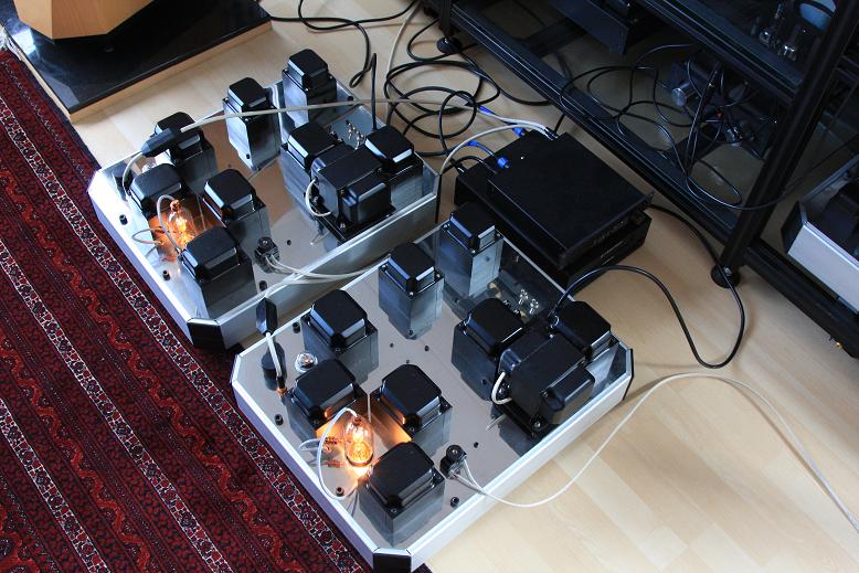 The bass are assumed by two Mullard 5-20 like PP KT88 mono blocks, made with the same aesthetic, delivering a punchy 30W (measured). The PP KT88 is absolutely hum free, and it is not possible to ear if it is running or not even with the head inside the boomer. I’m electronic engineer in military aerospace, and the CEM protection is not a secret for me. With the new tubes, the SE300B hum and HF noises are not audible with the head more than 10cm from the middle horn. I’m using a DSP as pre-amplifier, digital room correction & cross over (numeric parts of MINI-DSP 2X4HD+ 4 X PCM1794A Dac with hand made low noise power supply).