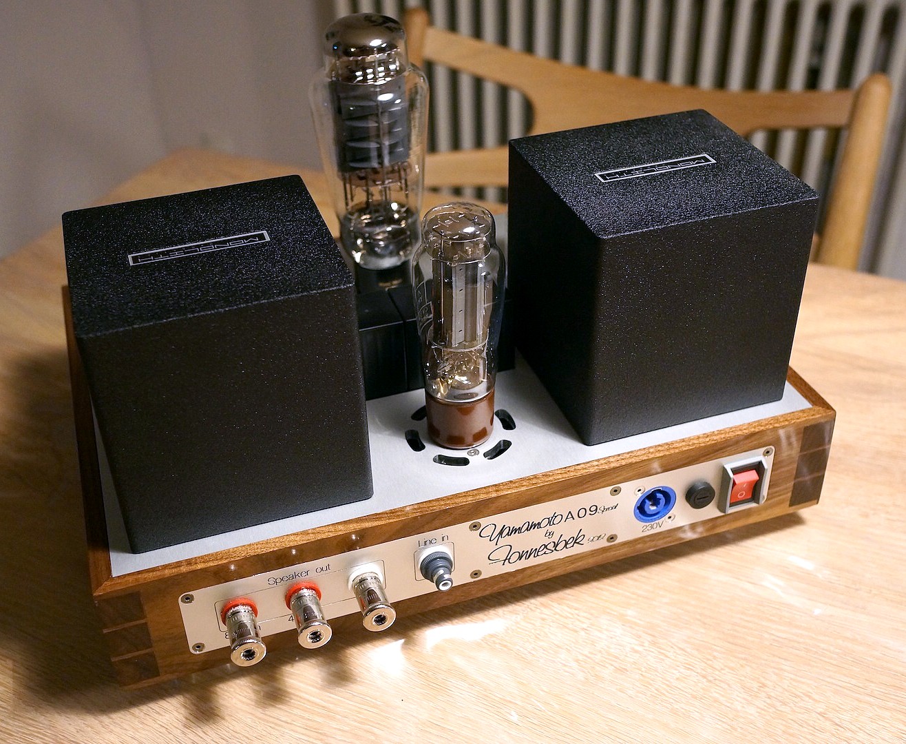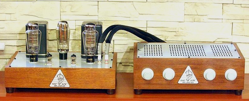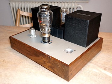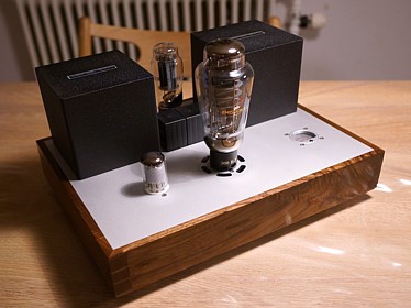 This is a beautiful build of our 300B tube kit, by Antanas Kilda from Lithuania. Very interesting is the elegant housing, self-made by Antanas. The shape is made possible by the flat size of the Lundahl SE transformers and the Lundhal choke, so these will fit all inside. Also the mains transformer is larger of course, and is outside of the chassis, where it belongs. Like this only one transformer cap was needed.