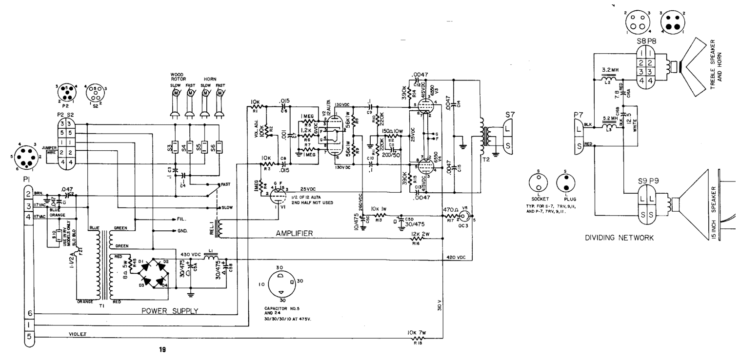 But there is more. When I looked deeper into the amplifier design, I was expecting so see all kind of special constructions to eliminate the hum problems. The least I expected was DC heating of course. But.... none of that at all. All tubes, including the pre amplifier, are simply AC heated. Then I looked at the DC power supply, too see how extremely well it was stabilized. Again nothing like that at all. Just a tiny little choke of 1 Henry. Today people work with 20 or 50 Henry, and have still residual hum, blaming the tubes and the capacitors. Those old designers of the LESLIE company, did not seem to have such problems.
