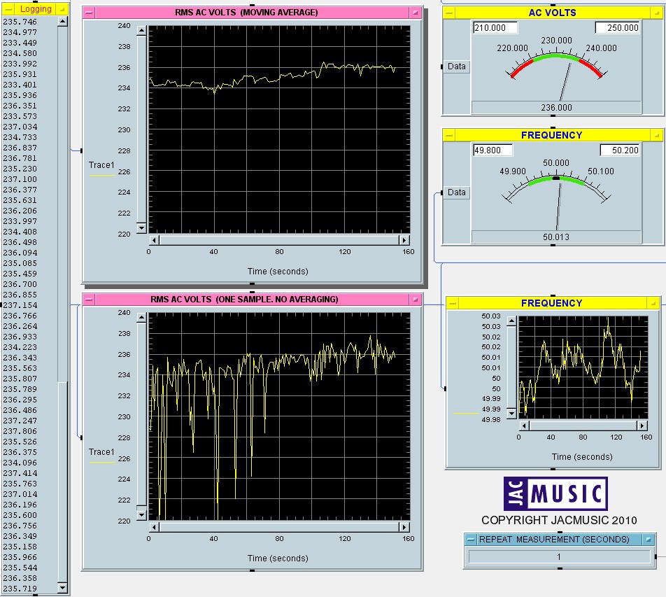 This plot was made over 160 seconds with the Agilent 34401a Multi meter, one of the finest for R&D purposes, with 22 bit accuracy. Measurements can be made single, or with delay. In the delay mode, the meter is averaging a number of repeated readings. In fact it can do both at the same time, and measure the frequency simultaneously. So the physical instrument has one display, but via the data cable, you can tap multiple displays, which show up in the software. I have used a program called Agilent VEE. So this expands the possibilities of this Multi meter very much. In VEE you can write the results to your hard disk, or Excel, or to a digital computer scope which is part of VEE.