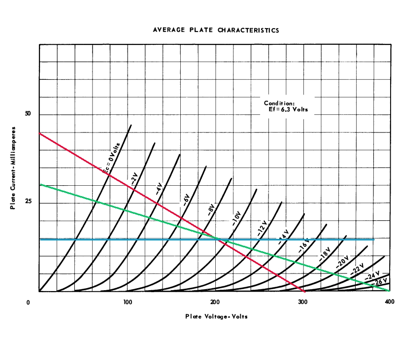 Those load lines are sure not ideal, because I just pencilled them in quickly. I only try do explain why the unlinear zone should be avoided, and then this tube can work nicely distortion free. At the same operating point, where they cross, you can see the red load dives into the unlinear zone, whereas the green load line stays away from there. An even much more ideal behavior is achieved with a grid choke, which is the blue load line.