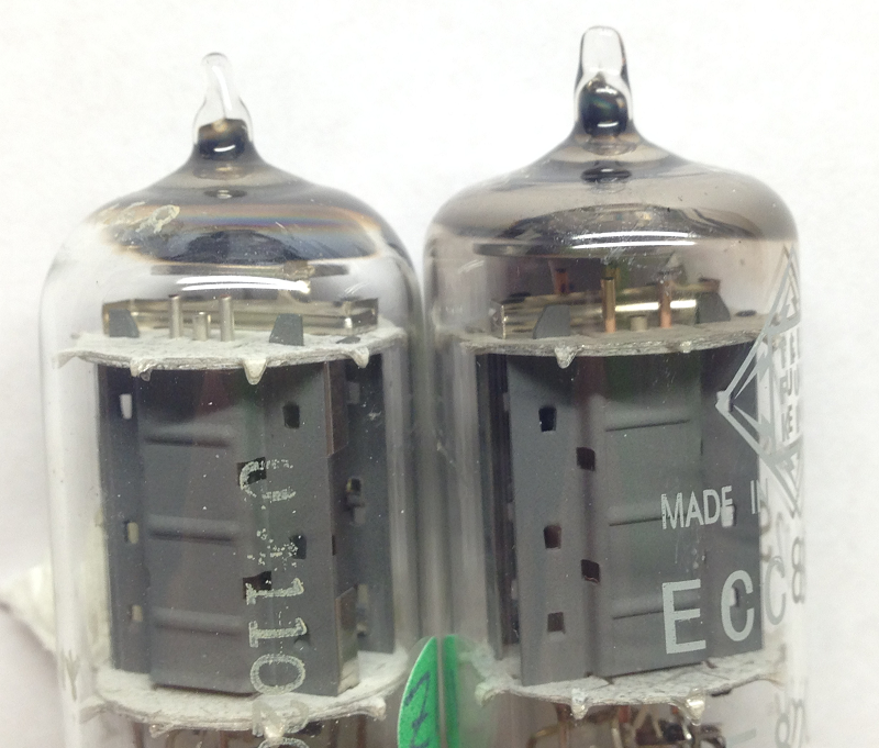 Faked Telefunken ECC802S (re branded Telefunken 6211). On the right is the fake you can see the grid is copper color. With the ECC802S in the left, the grid is white color.