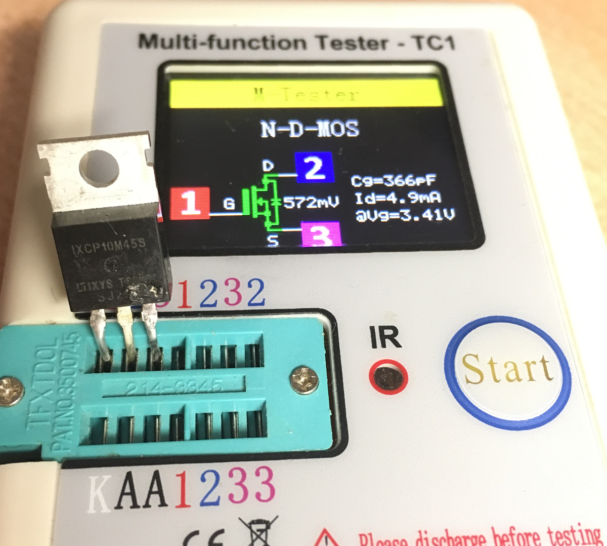 As you see, this little tester seems to identify the part as an NPN transistor. Which it is not, but this is a useful hint about the problem. At least it is not the same, that's what it tells me.