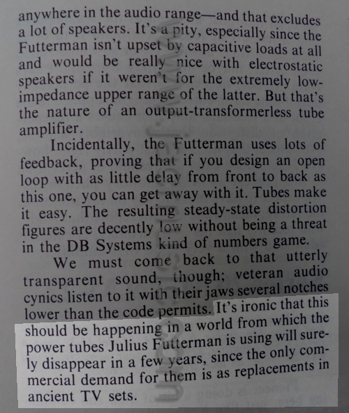 Please first read this interesting test above, in 'The Audio Critic'. The writer has a comment about the feedback method in this amplifier, and also about future unavailability of the 6LF6 tubes. Then read the comment on that, by Julius Futterman. 1979 Letter by Julius Futterman,to the Editor.'I am pleased with your evaluation of the sonic virtues of the H-3aa power amplifier but do take exception to two of your assertions : 1. The power tubes I use (6LF6) are being manufactured in the USA by GE and Sylvania. They are also being made in Japan and Yugoslavia. I have been informed that they will be around for many years. In your Vol. 1, No. 3 issue, page 4, you wrote that the Berning hybrid tube amplifier using 6LF6 tubes will be manufactured by Audionics. Also please note: The Acoustat X ($2.200) uses 6HB5 tubes, which is also a TV tube. This tube was used in my H-3 stereo amplifier in the 1960's. The Beveridge 2SW-1 ($7.000) uses 40KD6 tubes, also a TV tube. My point is at these two types are of even older vintage than the 6LF6 tube, yet you did not caution a buyer of the Beveridge system about their not being able to obtain them in a few years. I am sure if tubes do a better job in an amp or pre amp they will always be available from one source or another. 2. Before taking up the second subject that makes me unhappy I would like to digress for a minute, if I may. Before transistor amplifiers the rated impedance of most high fidelity speakers was 16 ohms. In Britain practically all speakers were 15 ohms. There were sound reasons for this as, all other things being equal, a higher impedance speaker is more efficient and the crossover design is not as complex. We are referring, of course, to moving-coil speakers. 3. The reason for the lower impedance of speakers today is, of course, the fact that transistor amplifiers, being voltage limited, provide more power for such speakers. As an interesting aside you implied in your review of the Tangent RS2 (Vol. 1, No. 5, page 25) that it was an inefficient speaker as you were able to make the Levinson ML-2 clip on it with a master tape of piano music. On the other hand, I can make the Tangent RS2 play very loud with the H-3aa. The reason for this is simple : The impedance of the RS2 at 70 Hz, for example, is 11.5 ohms; at 500 to 2000 Hz it is 9 ohms, and it rises steadily to over 20 ohms at 6 kHz, which is well above the fundamental tones of the piano. With the ML-2's 14 volt maximum voltage rating you can see that there is very little power to drive the Tangent. End of digression. 4. Electrostatic speakers are inherently of high impedance and this is lowered by means of a transformer. The Acoustat and Beveridge speakers use a different approach. They do not use a transformer; instead they employ very high voltage amplifiers to drive the speakers directly. The KLH-9, Quad, and Koss are examples of speakers using transformers. In general, the lower the turns ratio of the transformer the better the speaker because of tighter coupling and other factors that 1 will not go into here. The KLH-9 impedance is 16 ohms, the Quad 15 ohms and the Koss 4 ohms The KLH 9 and Quad were designed for tube amplifiers, the Koss for solid state. Thank you for allowing me to comment. Sincerely yours, Editorial Reply to Julius Futterman's LetterIt was unquestionably a miscarriage of justice that your amplifier was singled out for our general caveat about the future of vacuum-tube audio equipment. What's true of one particular design is true of them all: their longevity depends on the TV replacement market, the Russian aerospace industry and other factors outside the world of audio. We seriously doubt whether audio manufacturers by themselves could keep even a single vacuum tube factory in business through the 1980's. On the other hand, you may be quite right insofar as these other demands may preserve vacuum tubes from extinction for decades to come. Your guess is as good as ours or anyone else's. The rest of your comments all point to an implicit conclusion we have shared for quite some time, namely that the power amplifier and the loudspeaker should be conceived and designed as a single system, the "back end" of the audio chain, not as two separate all purpose modules that never quite mate optimally. The trouble is that very few audio designers have an equal mastery of both disciplines. For example, neither the Acoustat nor the Beveridge amplifier is as highly refined as yours, although their philosophy of integrated design is certainly valid. -Ed. The Audio Critic , 1979 Note by Jac about the use of 6LF6: Audio Critic makes a guess in 1979, about why TV tubes used by Futterman will soon become unavailable, and they write audio manufacturers cannot keep one single tube factory alive. Well, there is really a fundamental mistake in the reasoning of Audio Critic, and that is not because they could not know about tube HiFi being so popular now. It is rather not doing the math right. Tubes like 6FL6 were not used anymore for new design TVs somewhere around 1975 or so. But indeed, the TV replacement market was huge. A color TV used three of them. So the replacement market was accordingly large. One way or another, millions of 6FL6 are stored on boxes, barns, garages and other places. From this, some small supply of 6FL6 will always pop up. Probably small quantities, but it will occur very often. Just because they were made in such massive quantity. The situation would be totally another if we would be talking about a tube of which few were made ever since, and now everybody wants it. Like Telefunken ECC803S. That is very difficult of course, but with 6FL6 it is really the opposite. In addition, there is also the possibility some industry stock pops up, and then for a while there will be many for sale. About EL509:Theoretically it could replace 6LF6, but he EL509 market consists mainly of junk and fakes. The Russian ones can do only 0.5 Ampere, which doesn't even come near t