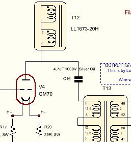 Then, via a capacitor, an output transformer is connected to the AC signal across the choke. Interesting, to this transformer the requirements are now also a LOT EASIER to fulfil. It is freed from this nasty DC current. It needs no air gap any more, it has still very little distortion.