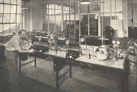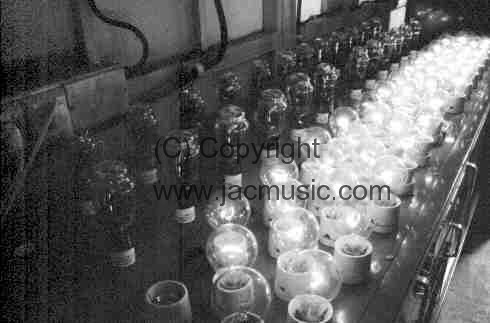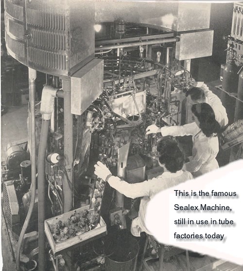 They just gettered the 205A and there you have a 205D. This tube, the 205D is a very good tube, it is state of the art so to say, and nothing was ever improved anymore from now on. Only the manufacturing methods of course, since 205D was entirely made by hand. Similar tubes from this period are 102D, etc. Here are some historical pictures from such a manufacturing line. These pictures are from 1939, from November issue of Electronics magazine.
