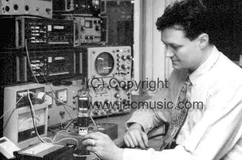 Here you see the later brand name AVVT tube being tested. This is one 300B that was burning all day and night in the factory, demonstrating the 300B lifetime of the tube. I got Alesa wearing a pink short and a neck tie for this photo shoot, in 1998.