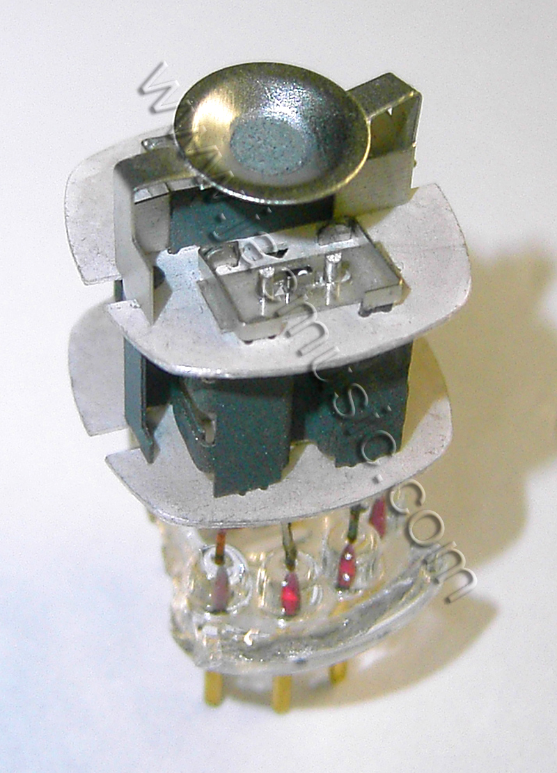 The anode (plate) sides are open. That looks nice, but is done for other reasons. It allows heat radiation to escape directly. So any "glow" you can see, was radiated out of the tube inside directly. The most important reason is, they can adjust the plate distance this way. Detail1: Notice the anode is connected to the socket by a red copper wire. This is done to get the heat of the plates out. Detail2: Notice the isolation plate is made of black material. This is the only right way, and was normal with old tunes as well. Still some other tube vendors use cheaper, uncovered shields. Good to see the Russians stick to the old quality. |