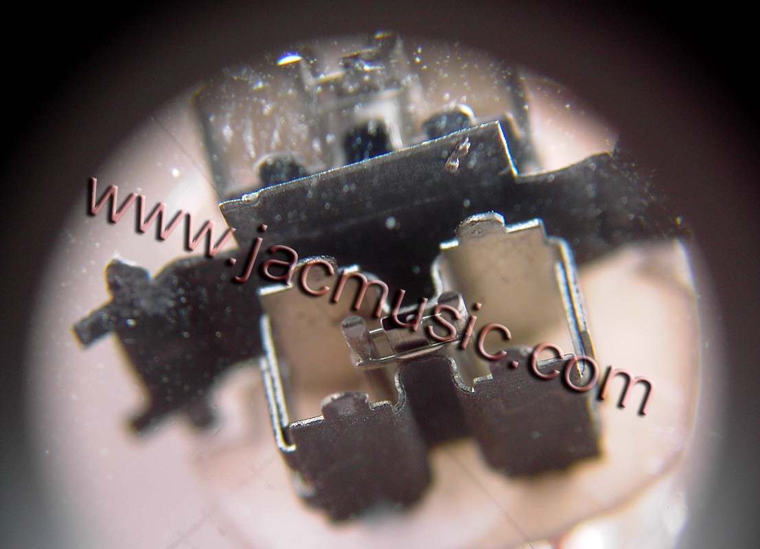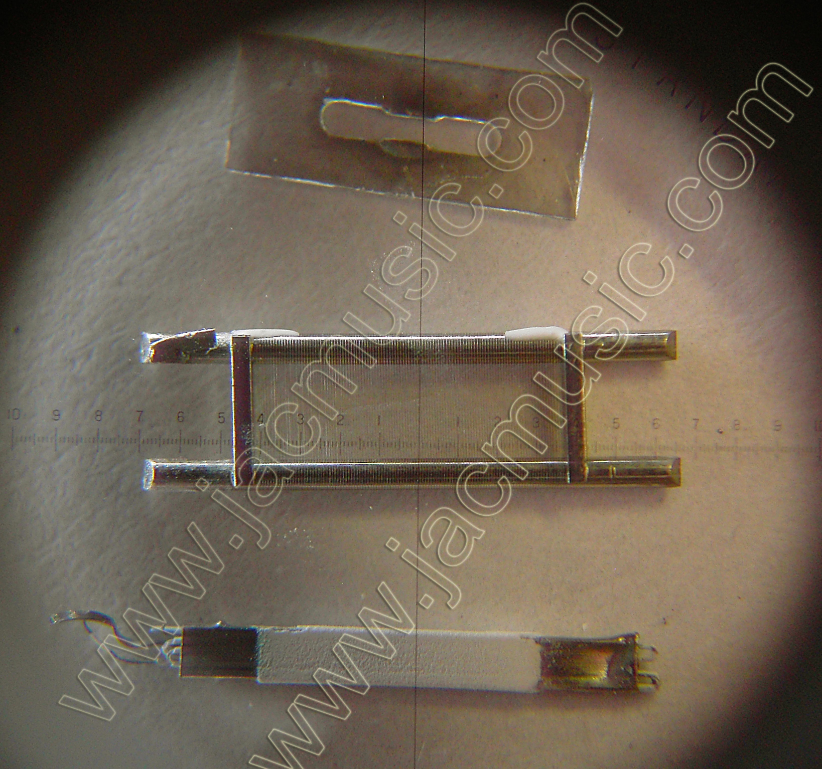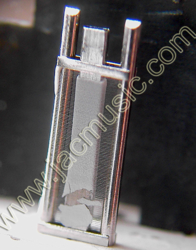 When you click on this microscope picture, you see the original in maximum resolution. It may take some time to load. There is a precision optical scale overlaid of 0.1mm steps. So what you see here, is the grid wire distance is about 0,07mm and the wire thickness is about 0,01mm, or 10micrometer. To get an idea, this is close to dimensions of a bacteria. The grid is looking optically very well made. Note, what we have here is a FRAME grid. That is done whenever the grid wire is so fine, you cannot make a self-supporting grid anymore. A frame grid is made from a hard metal frame, and the wires are wound around it. Invented by Telefunken as far as I know, and first applied in tubes likes ECC88, and ECC803S. Now I make a discovery. What I noticed here, the grid is obviously glued to the mica. This deals with the unwanted grid rattle, a kind of microphonic effect. If anyone knows what glue of compound that is, I am VERY interested in finding that out. Also where to buy it. CONCLUSION: Electro Harmonix makes a really good quality tube here, and the inside piece parts look amazingly nice build. There is a lot of old craftsmanship inside, a tube like this you can't design from one day to the other. You need tons of special machines and equipment. The grid wire used here is so fine, it is amazing this can be handled at all. |