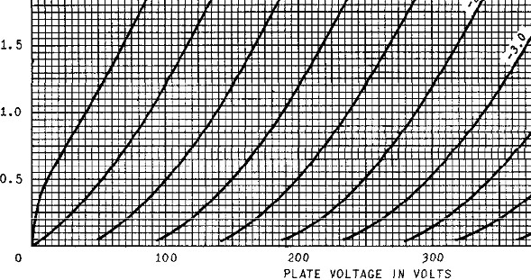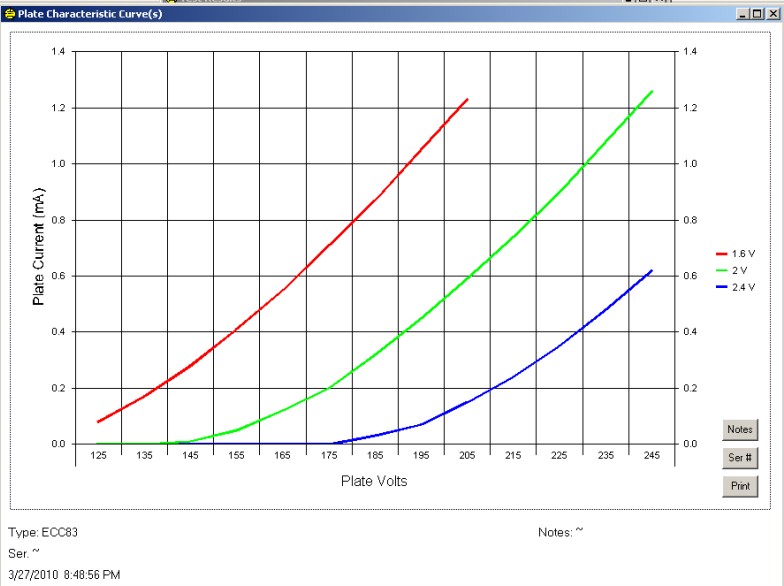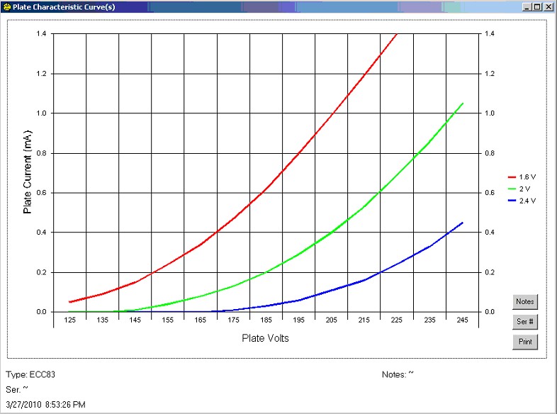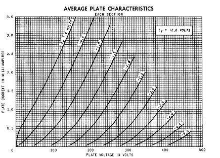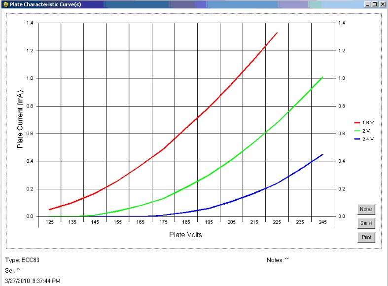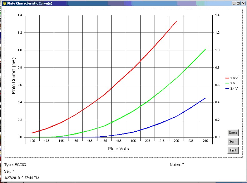 Here is a detail from the same datasheet. Look at those nice, parallel lines, with their well (hand corrected) fake cut off points. So the lines do not point all to some vanishing point, as with real life tubes. The distance between each line is the same, regardless where you look. This means the tube has no distortion. Now with amplifying devices, distortion and gain go hand in hand. So for a tube with very high (100x) gain, some distortion is NORMAL. However, not so when looking at those GE datasheets here. Wow! they have no distortion. How did they do that? Well for drawing such curves they used a tool called "flexible ruler". Those you can bend it in any desired shape to draw curves. Anyway, these curves show how an ideal tube must look like, but how ideal are they in real life? Lets see what I measured with the AT1000 curve tracer, and a nice collection of NOS and NEW made tubes. GENERAL IMPORTANT REMARKS ABOUT ECC83:Ever since I test NOS ECC83 and 12AX7, I find that the average of new production is not at 1.2mA by the text book. The average is always around 1.1mA. Also for new tubes, and 1.0mA is often seen. Don't ask me why that is, but it is so with NOS and NEW tubes. This would be a problem by itself, as plate current at fixed grid voltage is no reference for anything, just the thing is, the AVARAGE must be 1.2mA, and that is not what it is. Perhaps NOS tubes are getting too old. The only NOS which do this out if the box still, are TESLA, and most of all Siemens E83CC. All others are always a fraction too low. The only tubes which seem to come out of the boxes ALL as Bogey tubes, are TESLA and SIEMENS&HALSKE TRIPLE MICA E83CC. This is the most incredible good testing tubes I have ever seen. These outdo ANY BRAND WHATSOEVER.The test data was taken with the Amplitrex AT1000. This digital unit has 10bit resolution at full scale, which is 0.1% but specially at the end of the scale resolution gets kind of "digital" so it shows "steps", which can be seen at the lower end of some curves. The low scale is 10mA, so digital steps are 0.01mA. No problem at 10mA, but it gets visible below 0.5mA of course. Also the transconductance is always ending on "00". So steps are like 1500, 1600, 1700, etc, and a tube with 1600 -1700 on both systems is in reality for instance 1641 -1692. No problem, as long as we know it. I verified the AT1000 results against the higher resolution Russian L3-3 and the AT1000 is very accurate. When you compare the graph with the test data, of course you will find the test data from the table in the curves, since it's from the same tube. The curves are made from System1 , not System2 . Look just above the number 195 at the blue line. The measured value is right above that number 195. So not at the left or the right. It's a bit unusual, but it's how the AT1000 works, the software for the graphs is a Microsoft module, called MSCHART, the Amplitrex builder told me, so that explains it. ABOUT ECC83 TEST DATA IN GENERAL:Look at the test data. The tube is set for -2Volt grid, and then at 250V plate the tube is tested So the plate current is exactly 1.2mA on both systems. This is no "Must", and in reality most tubes have a deviation of +/- 0,3mA and are fine tubes still. Also Tesla can have some deviation. The transconductance is exactly right 1.6m/V. Next thing is something O observed more often: Gain is a bit lower at around 80...85x. I don't know what that is, but I seldom find an ECC83 with a gain if 100x and when I do, it's a bit funny testing tube anyway. Plate impedance is a bit lower than average, this is normal too, and plate impedance goes up somewhat while a tube ages, and transconductance goes down. These two things together keep the gain constant while the tube ages, since gain is Rp x transconductance. So the data table is very nice TUBE CURVES Each tube curve by itself is a genetic fingerprint, meaning it holds the data for the other curves too. So we draw only tree curves, it is enough, and otherwise the plotting of all those curves would take too long.