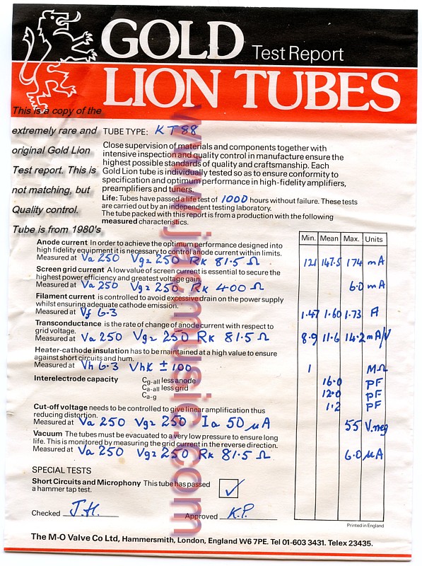 - New made GOLDEN LION Test Specifications. What specifications? Today, many manufacturers blow a cloud of smoke around the question, how tubes should be checked for quality. For a serious tube dealer, trying to do a good job, this becomes a problem, as he has no way to do incoming inspection. For instance NEW SENSOR the #1 maker of KT88 has always refused to give me the data for incoming inspection. They just say the tube ARE already tested, so they are good, and that's what they are. Period. So problems can get passed on to the buyers before you know it. My opinion is, a tube always needs to have so called acceptance limits SPECIFIED by the manufacturer. Interesting, on those historical certificates, the acceptance limits are there indeed. For instance Plate Current is between 121 and 174 mA. With that information, your tube dealer can test what is a good tube, and what is a reject. I tried to get incoming inspection data from NEW SENSOR. After many rounds of discussions, I got the following answer from J.C. Morrison by phone, who was at that time the chief technical engineer of New Sensor New York. 'We only present you the data as on the boxes. We tell you the tubes are 100% tested. We will not supply acceptance level data. The tubes are good. We sell most tubes into the guitar amplifier market. The HiFi market is only a few percent of our sales anyway. We can easily do without those nasty HiFi customers if we have to. I am sorry but this is how things are. So take it or leave it'. Later, I met J.C. Morrisson on some occasions, and I really have to say he is such a wonderful and inspiring person. He doesn't work for New Sensor any more, and I think he was only speaking with the voice of his boss at that time. Well.... anyway, after this conversation, I decided to take his advise: Take it or leave it. Well, I don't take it, when they refuse to replace broken tubes to me, that lost vacuum just from resting in my stock room, unused. I removed this brand from my sales program. My personal opinion about GOLD LION NEW SENSOR: Too expensive. Not any better than Electro Harmonix which costs only half. Risk on vacuum problems is too high for what they cost.