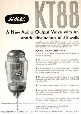 | KT88 | Beam tetrode. Upgrade of KT66, designed by M-OV (GEC, UK). KT stands for 'Kinkless Tetrode.' |